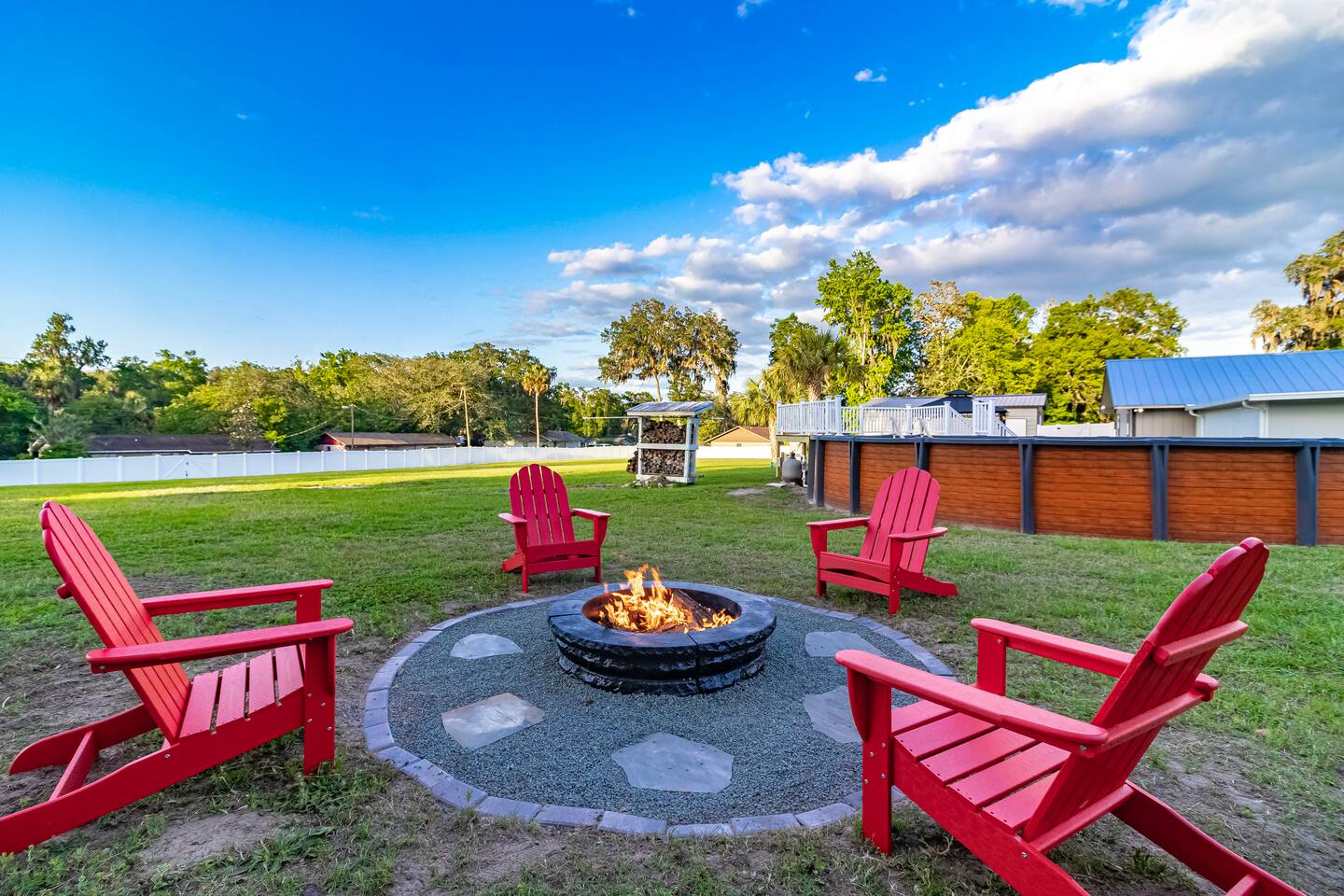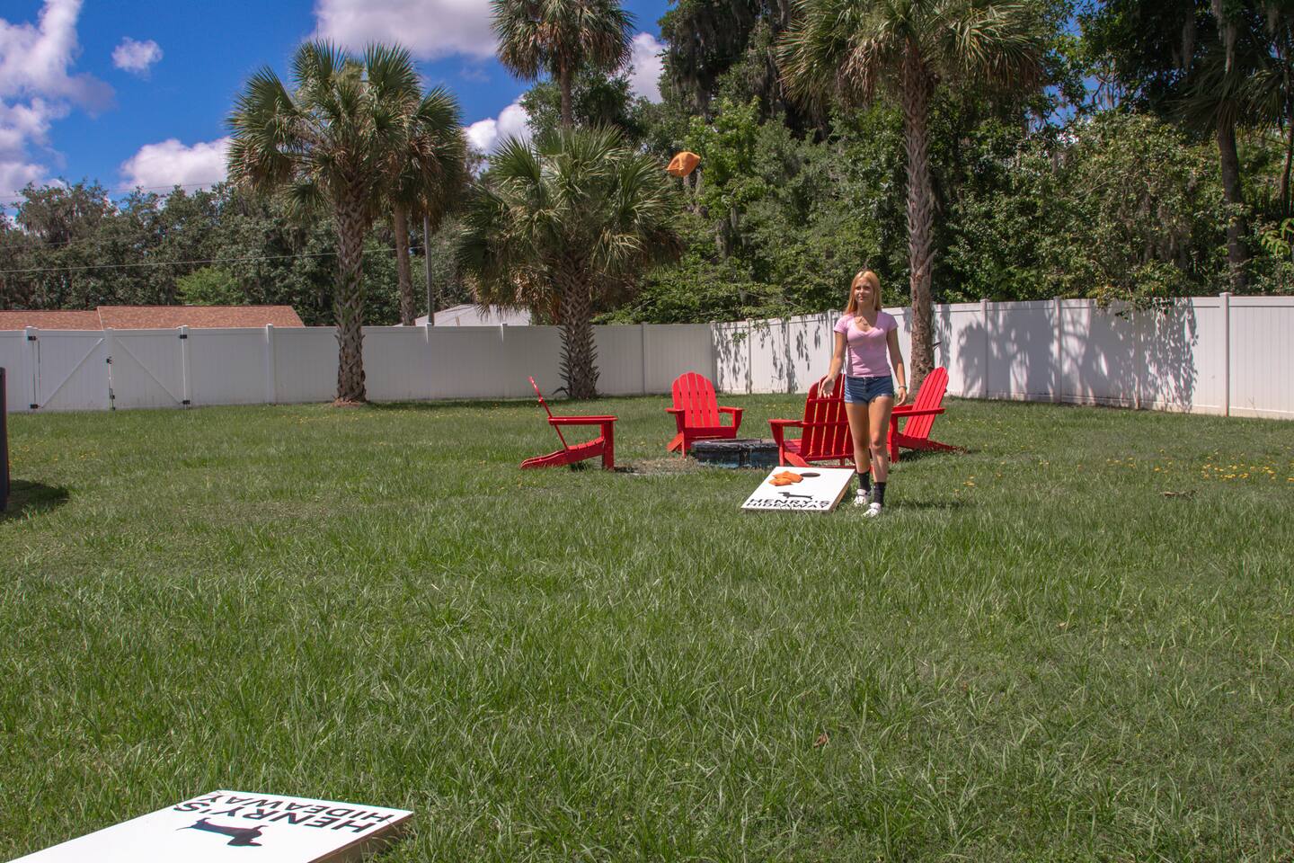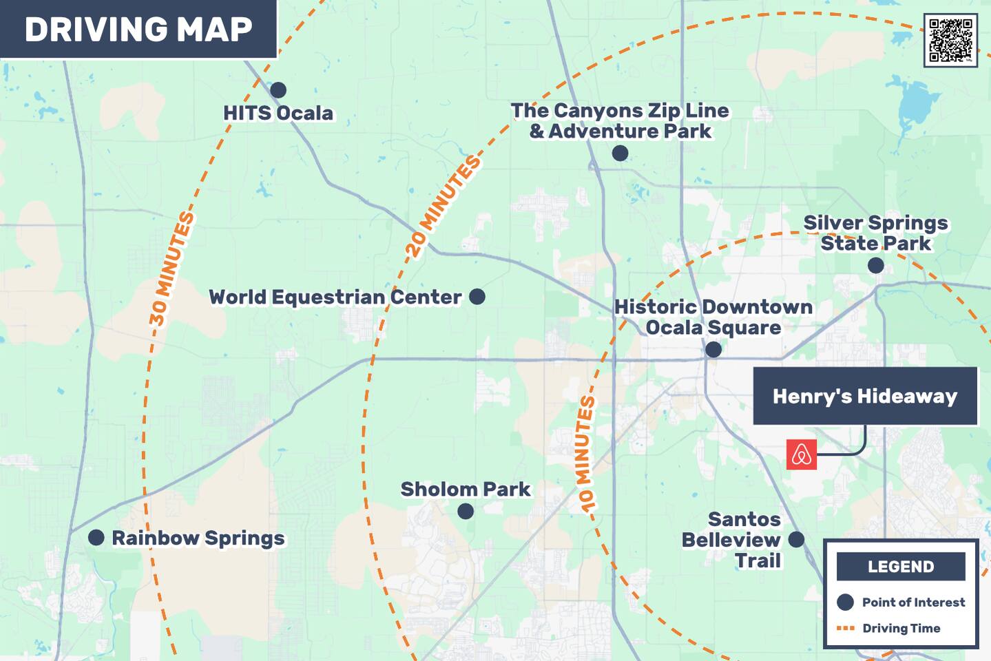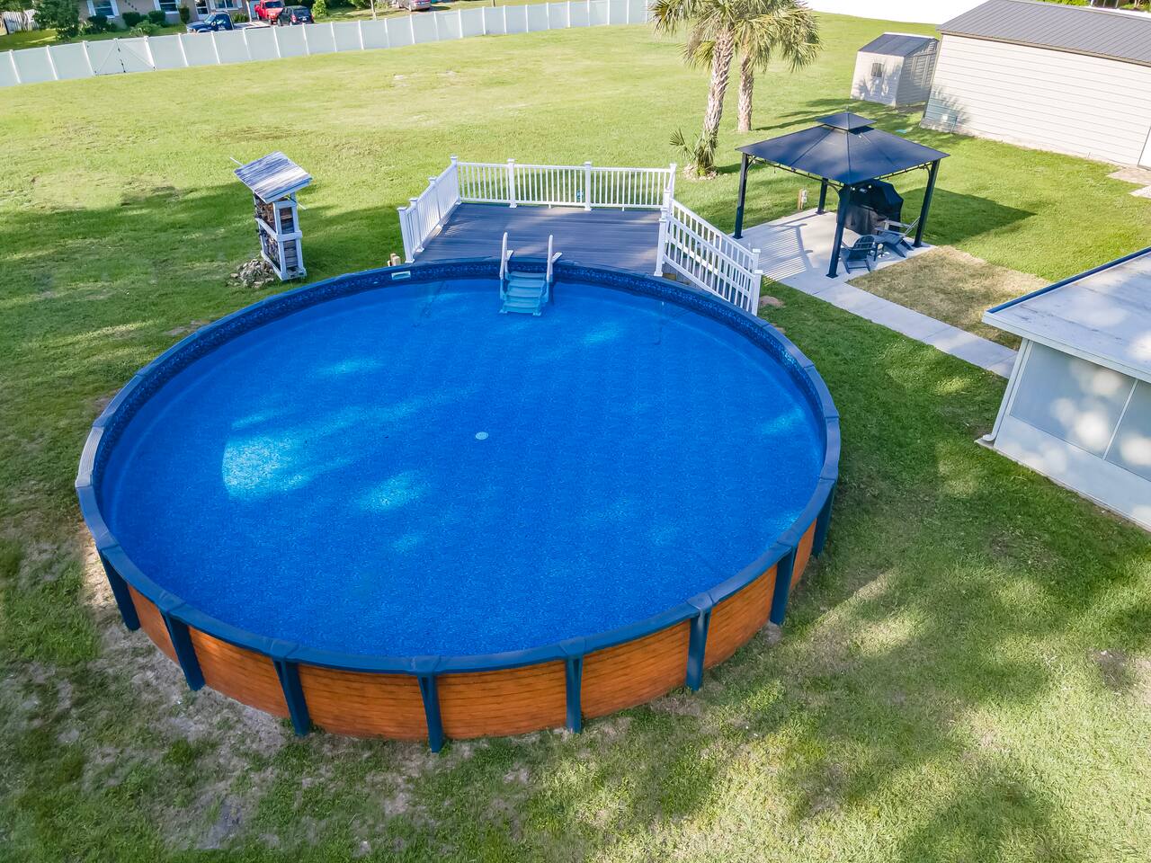 The Space 3 comfy bedrooms, 5 total beds: 2 king beds, 3 twin beds, plus a queen pull-out sofa in the detached game room. Open concept living: Relax beneath high-beamed ceilings on the sectional or recliner and stream your favorite shows on the 65″ Smart TV. Chef-ready kitchen: Modern stainless appliances, stocked pantry, and all the cookware, bakeware, and small appliances you could need. Screened lanai: Enjoy meals at the dining table for eight or sip your morning coffee on the sectional overlooking the yard/pool area. Pool oasis: 4-ft-deep above-ground pool with easy ladder entry—perfect for cooling off under the Florida sun. Detached game room: Climate-controlled and steps from the main house, featuring an 8-ft pool table, 60-game arcade, 55″ Smart TV, beverage fridge, and queen sleeper sofa. Outdoor fun: Fire pit, gazebo with Weber grill, corn-hole, pickleball setup, and agility course for furry friends. 🐾 Pet & Family Friendly We love your pups as much as you do! Up to two dogs welcome (case-by-case for more). The fully fenced 1.5-acre yard gives pets room to play while you relax. Baby gear available on request: high chair, booster seat, and pack ’n play. “Our dog felt right at home!” – Guest Review, 2023 🌴 Amenities You’ll Love Fast, reliable Wi-Fi — perfect for work or streaming Smart TVs in every room (BYOP — bring your own password!) Complimentary toiletries, towels, and starter coffee kits On-site laundry: brand-new Samsung washer & dryer in the garage 2-car garage, extended driveway & 50-AMP RV hookup 📍 Prime Ocala Location Henry’s Hideaway is just minutes from: Downtown Ocala dining and shops Silver Springs State Park World Equestrian Center Scenic hiking, kayaking, and zip-lining trails 💡 Guest Access & Extras Guests enjoy full, private access to the house, lanai, yard, pool, and detached game room. Smart-lock keyless entry makes check-in easy and secure. Rental contract required; our friendly local support team is always available if you need assistance. Experience Ocala’s charm, comfort, and endless fun at Henry’s Hideaway. Bring your loved ones (two- and four-legged alike!) and make lasting memories in this one-of-a-kind family retreat. Book your stay today and let the relaxation begin!