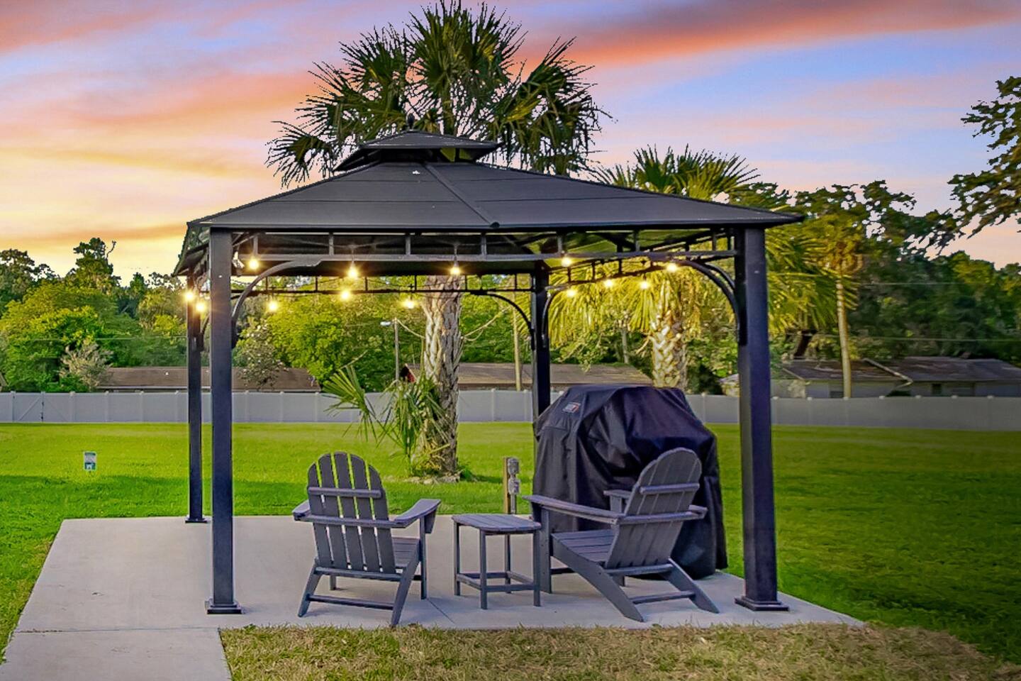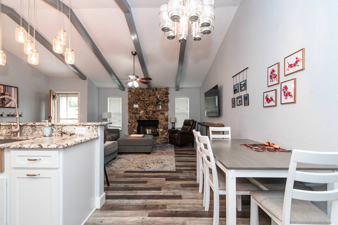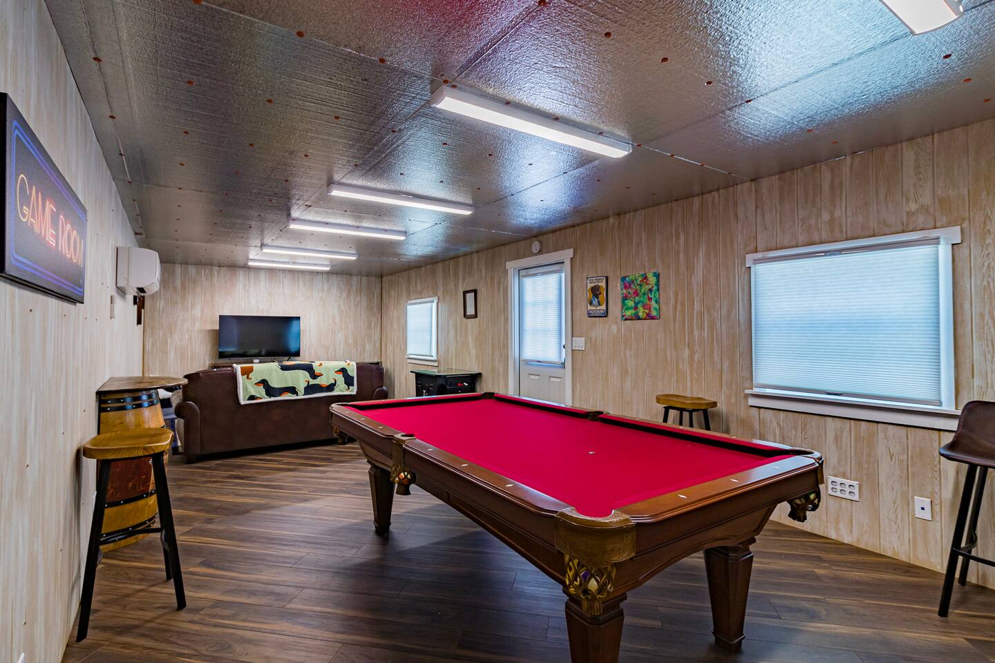 The Space 3 comfy bedrooms, 5 total beds: 2 king beds, 3 twin beds, plus a queen pull-out sofa in the detached game room. Open concept living: Relax beneath high-beamed ceilings on the sectional or recliner and stream your favorite shows on the 65″ Smart TV. Chef-ready kitchen: Modern stainless appliances, stocked pantry, and all the cookware, bakeware, and small appliances you could need. Screened lanai: Enjoy meals at the dining table for eight or sip your morning coffee on the sectional overlooking the yard/pool area. Pool oasis: 4-ft-deep above-ground pool with easy ladder entry—perfect for cooling off under the Florida sun. Detached game room: Climate-controlled and steps from the main house, featuring an 8-ft pool table, 60-game arcade, 55″ Smart TV, beverage fridge, and queen sleeper sofa. Outdoor fun: Fire pit, gazebo with Weber grill, corn-hole, pickleball setup, and agility course for furry friends. 🐾 Pet & Family Friendly We love your pups as much as you do! Up to two dogs welcome (case-by-case for more). The fully fenced 1.5-acre yard gives pets room to play while you relax. Baby gear available on request: high chair, booster seat, and pack ’n play. “Our dog felt right at home!” – Guest Review, 2023 🌴 Amenities You’ll Love Fast, reliable Wi-Fi — perfect for work or streaming Smart TVs in every room (BYOP — bring your own password!) Complimentary toiletries, towels, and starter coffee kits On-site laundry: brand-new Samsung washer & dryer in the garage 2-car garage, extended driveway & 50-AMP RV hookup 📍 Prime Ocala Location Henry’s Hideaway is just minutes from: Downtown Ocala dining and shops Silver Springs State Park World Equestrian Center Scenic hiking, kayaking, and zip-lining trails 💡 Guest Access & Extras Guests enjoy full, private access to the house, lanai, yard, pool, and detached game room. Smart-lock keyless entry makes check-in easy and secure. Rental contract required; our friendly local support team is always available if you need assistance. Experience Ocala’s charm, comfort, and endless fun at Henry’s Hideaway. Bring your loved ones (two- and four-legged alike!) and make lasting memories in this one-of-a-kind family retreat. Book your stay today and let the relaxation begin!